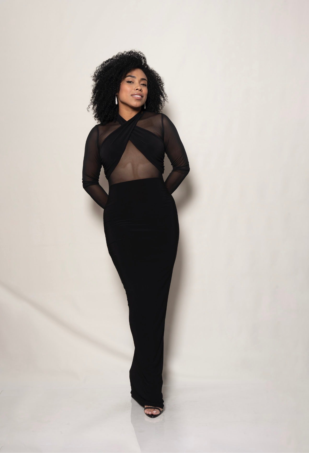 Vestido largo en malla negra con escote cruzado y transparencias. Diseño ceñido que estiliza la silueta y aporta un look sensual y sofisticado.