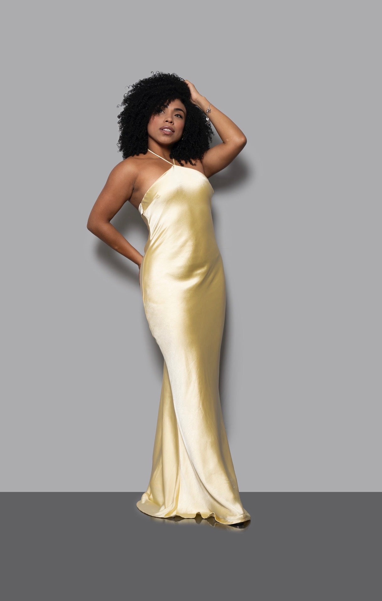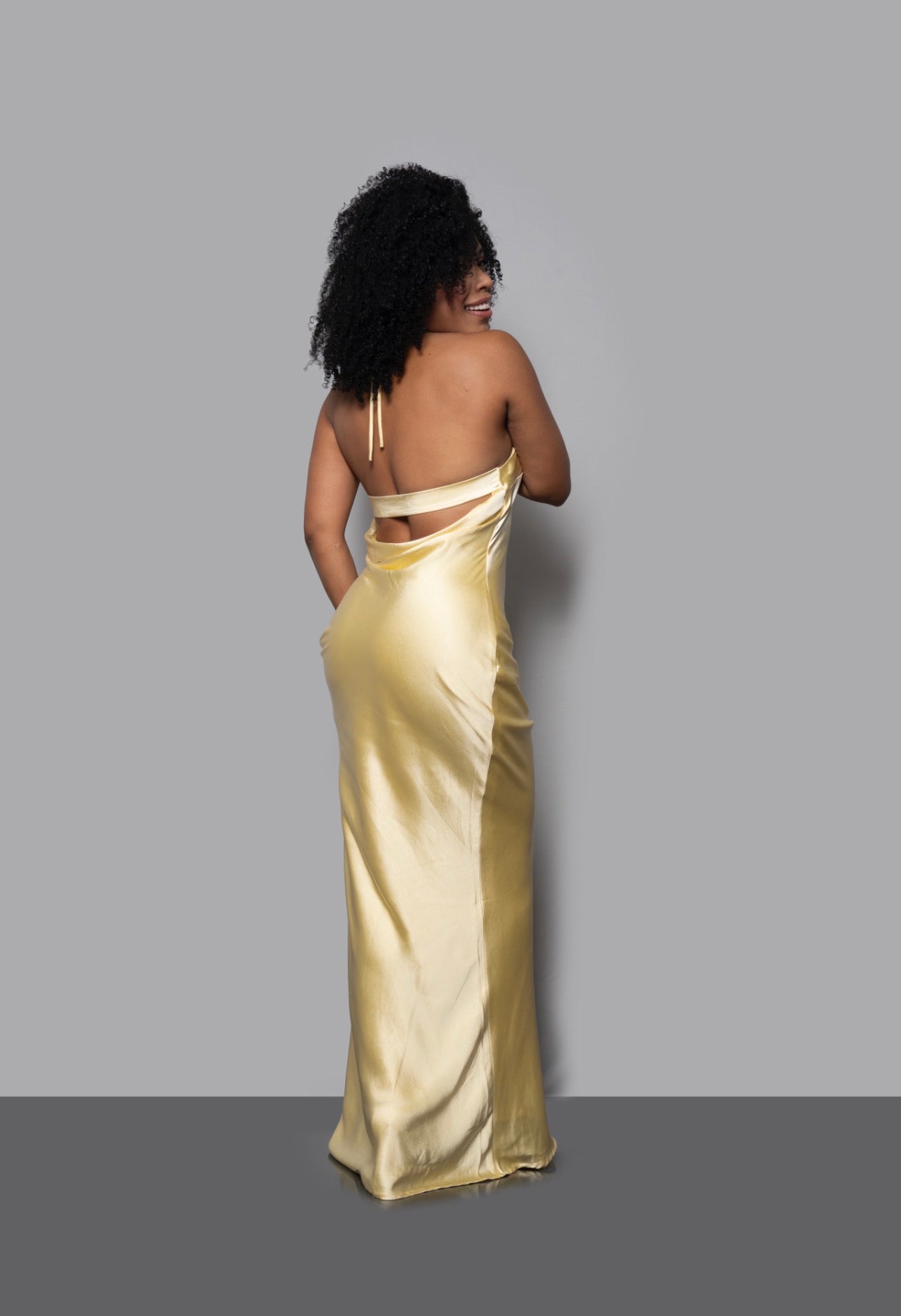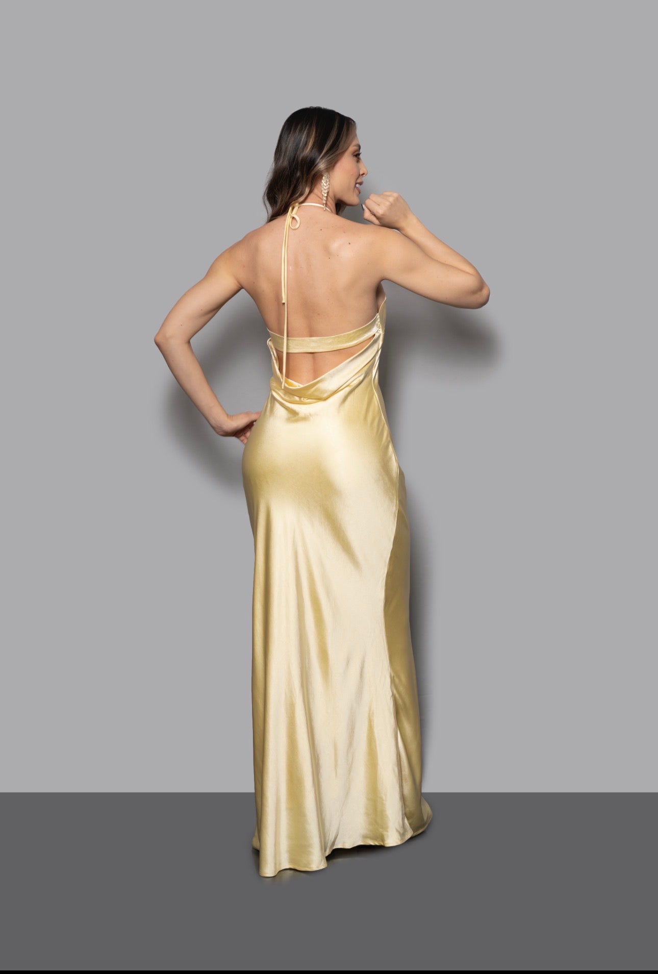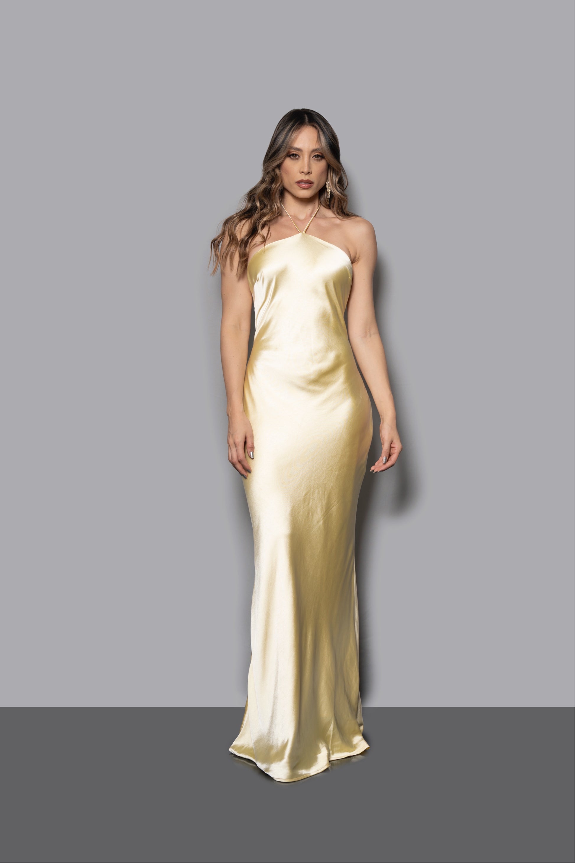 Vestido largo en tono amarillos pálido suave, elaborado en tela satinada que aporta un brillo sutil y sofisticado. Su diseño limpio y caída fluida realzan la silueta con naturalidad, creando una pieza atemporal pensada para destacar con elegancia en eventos especiales.