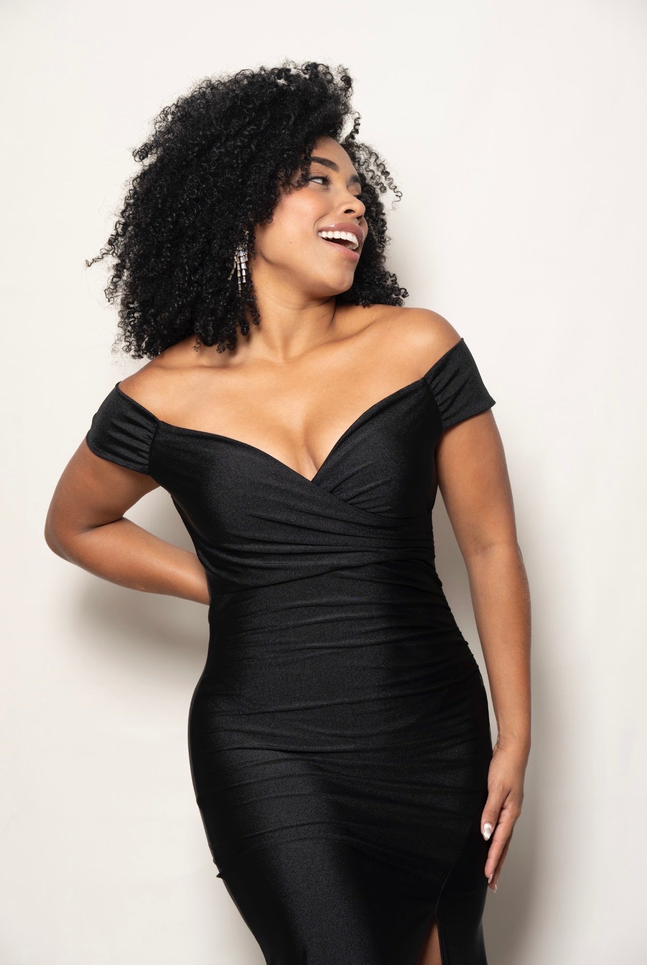 Su silueta ajustada y tela licrada abraza el cuerpo con precisión, resaltando las curvas de forma sofisticada, mientras el escote off-shoulder aporta un aire sensual y refinado, dejando los hombros al descubierto con absoluta delicadeza.