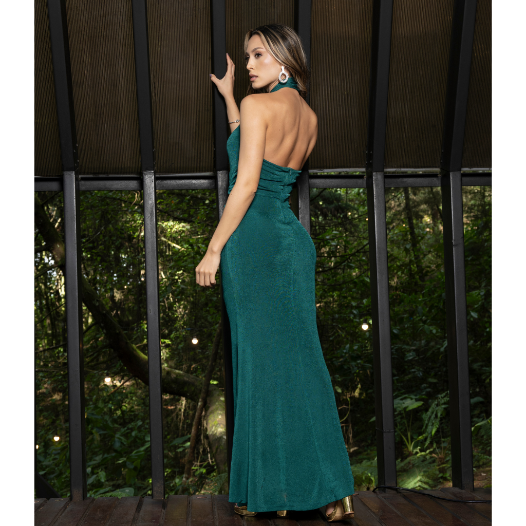 El diseño es elegante y sofisticado, con un toque atrevido gracias al escote frontal tipo "keyhole" y el drapeado en la cintura que estiliza la silueta. Los tonos rojo y verde esmeralda lucen poderosos y festivos, ideales para eventos de noche o celebraciones formales.