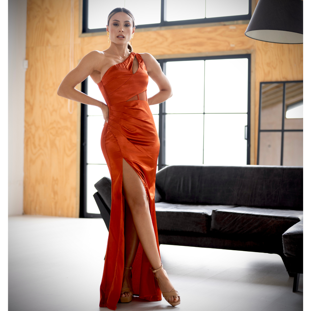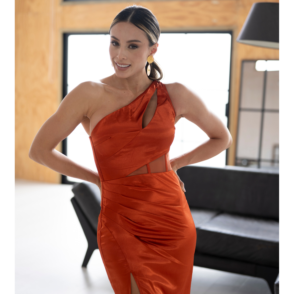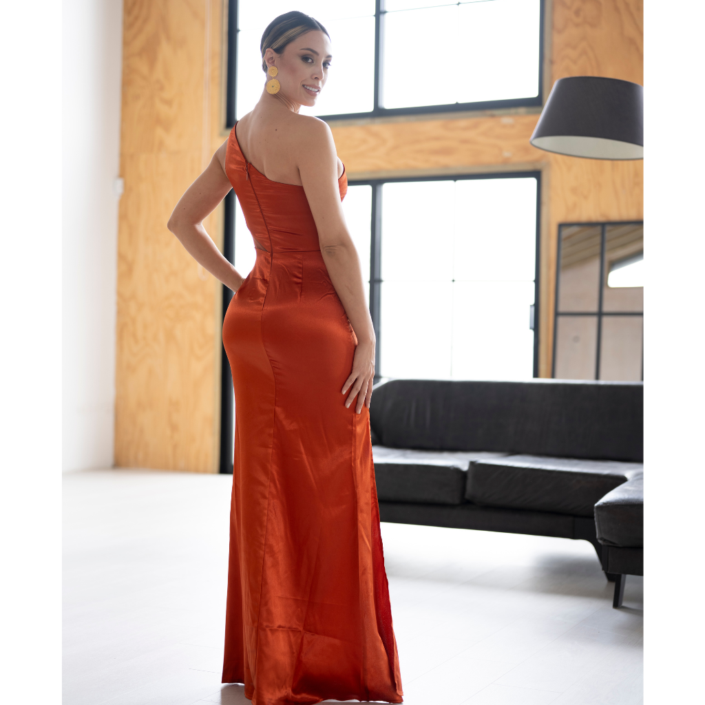 Deslumbra con su tono cobre satinado, abertura frontal y diseño asimétrico con detalle en el escote. Su estructura envuelve la silueta con carácter y sofisticación. Un homenaje al poder femenino que redefine lo clásico con fuego y forma.